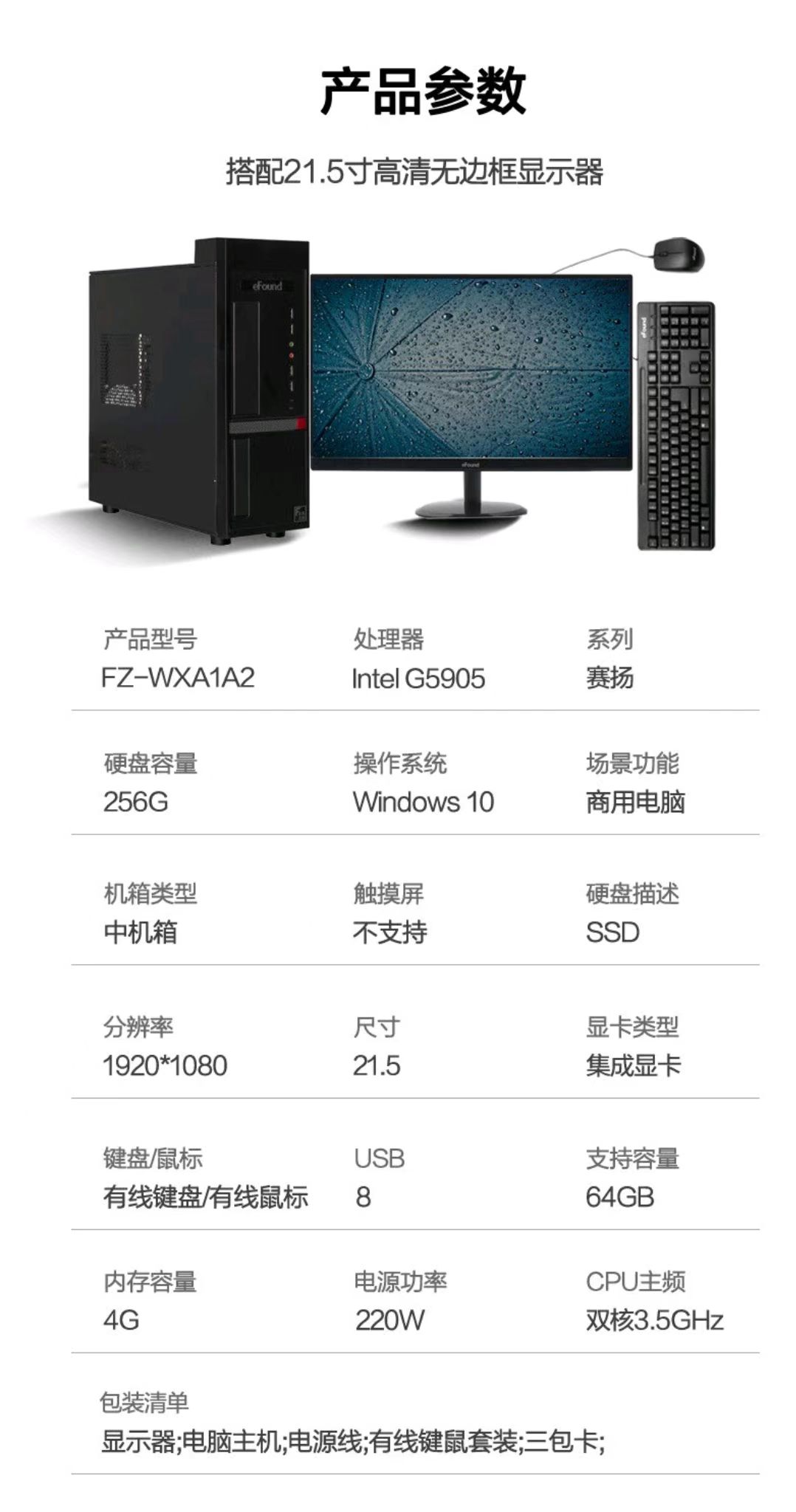 方正(eFound)文祥 臺(tái)式機(jī)FZ-WXA1A2英特爾G5905/4G/256SSD/21.5LED 自營