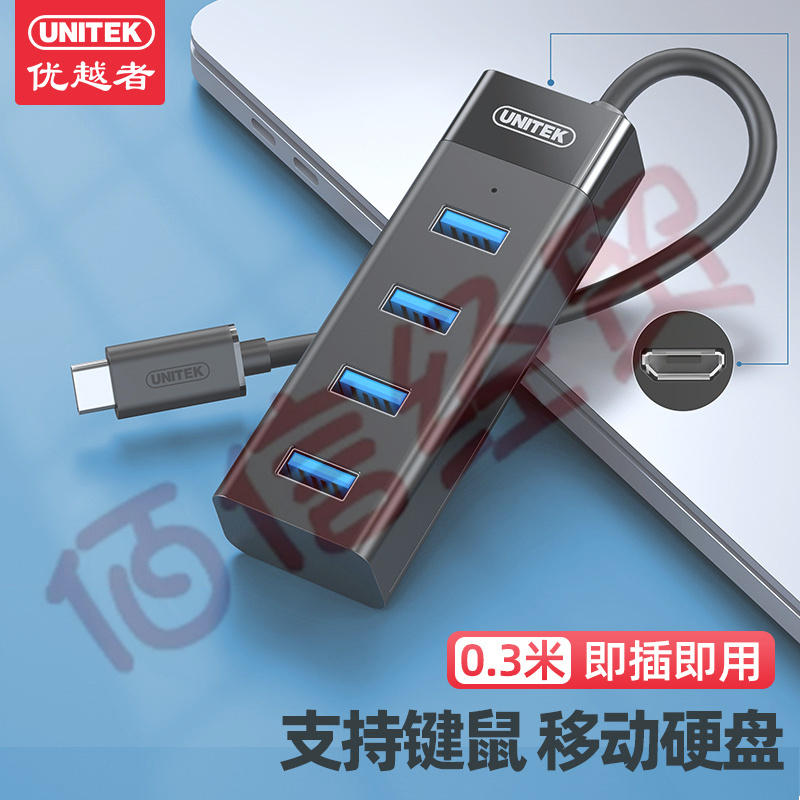 優(yōu)越者(UNITEK)USB3.0分線器 一拖四 type c 擴(kuò)展塢 筆記本電腦 多接口HUB集線器0.3米 Y-3098LBK 自營
