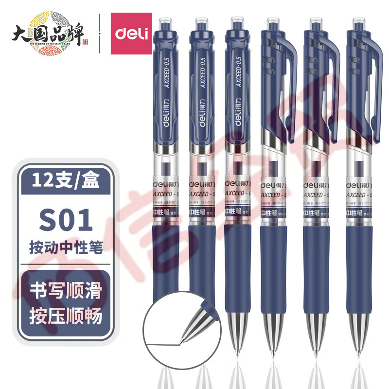 得力(deli)S01中性筆簽字筆 0.5mm子彈頭經(jīng)典辦公按動筆水筆 墨藍(lán)12支/盒 自營