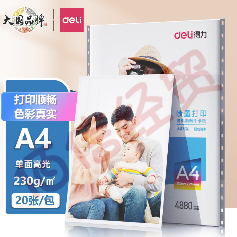 得力(deli)A4 230g高光面照片紙 相片打印紙 20張/包 11825 自營