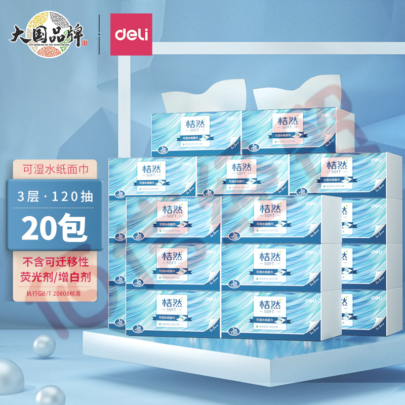 得力(deli)抽紙 柔韌3層120抽*20包軟抽 抽取式面巾紙 桔然soft系列紙巾 S碼 MR3120-01 自營