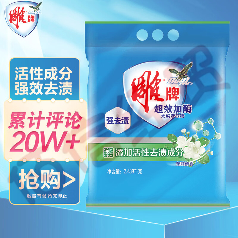 雕牌 超效加酶無磷洗衣粉2.438kg 茉莉清香 強(qiáng)效去漬 深層去污 白衣潔白 彩衣鮮艷(新老包裝隨機(jī)發(fā)貨)1袋價格 每箱4袋(整箱售) 自營