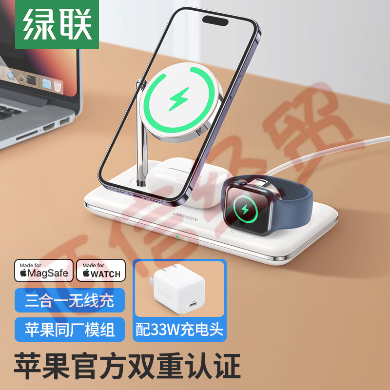 綠聯(lián) MFi認(rèn)證 蘋果三合一無線充電器15W蘋果Magsafe磁吸支架快充適用iPhone14/13/12/Apple Watch8/7手表耳機(jī) 自營