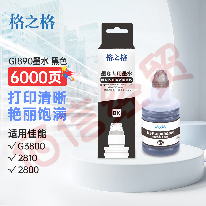 格之格G2800墨水適用佳能G1800 G1810 G2810 G3800 G3810 G4800 G4810打印機(jī)GI-890黑色墨倉式墨水