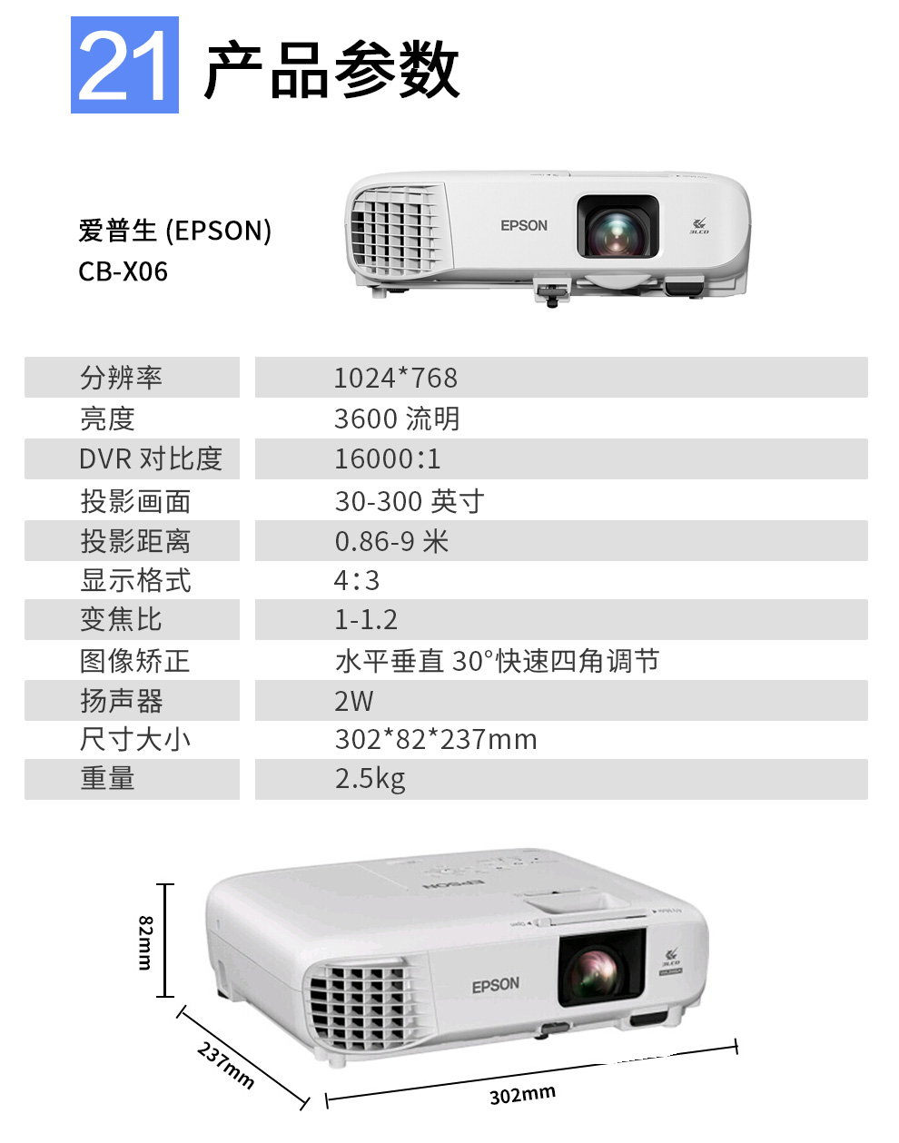 愛普生(EPSON) CB-X06 投影儀辦公會議培訓(xùn)商務(wù)投影機教育教學(xué)便攜投影儀 3600流明 白色