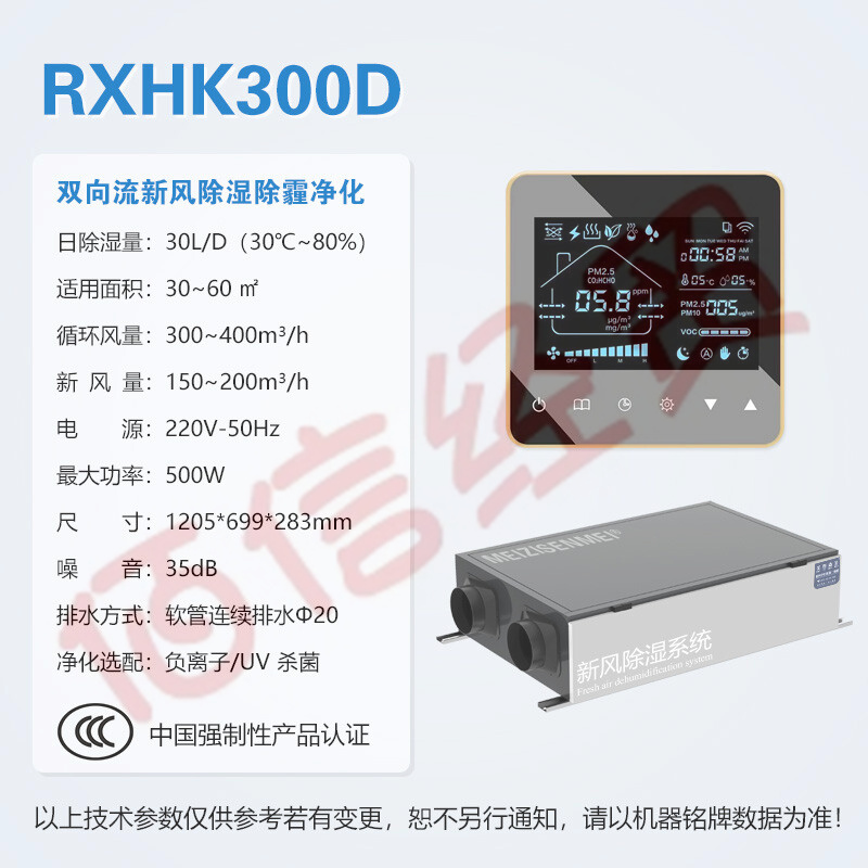 美資森美(MEIZISENMEI)雙向流全熱交換新風除濕抽濕一體機中央吊頂?shù)叵率曳丽渤背闈衿?RHXF300D無遙控器 自營