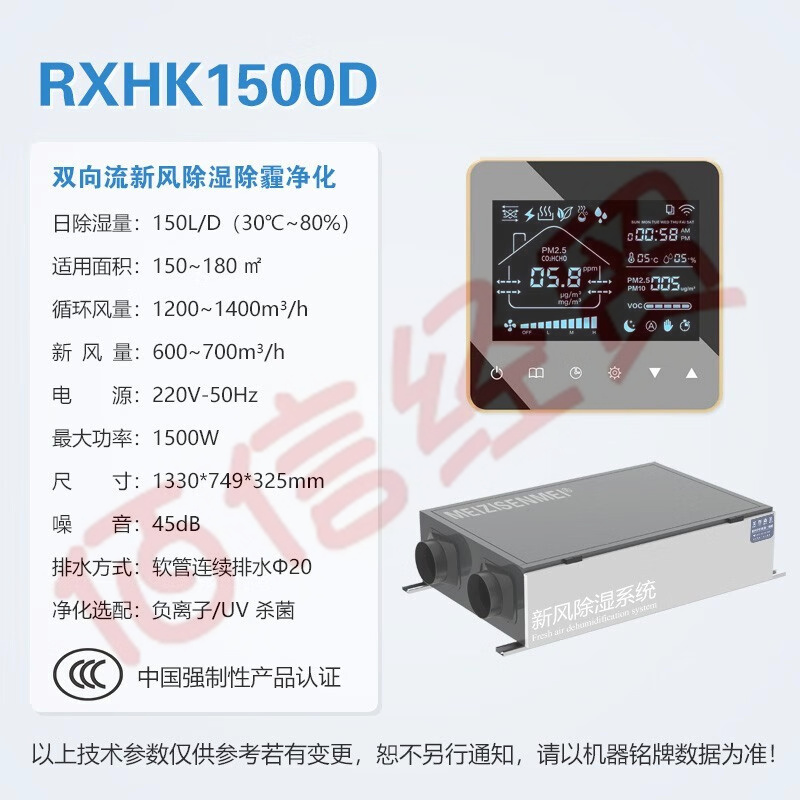 美資森美(MEIZISENMEI)雙向流全熱交換新風除濕抽濕一體機中央吊頂地下室防霾除潮抽濕器 RXHK1500D無遙控器 自營