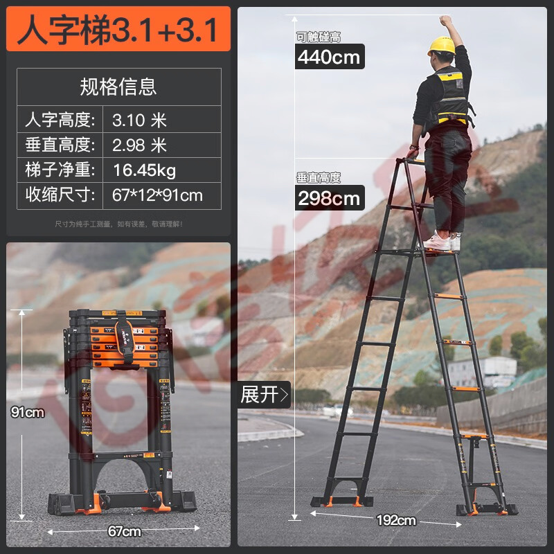 巴芬伸縮梯多功能梯子家用梯人字梯加厚鋁合金工程梯升降直梯折疊樓梯 人字梯3.1米【防滑加寬踏板】 自營