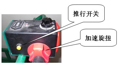 在通電(鑰匙開關打開)情況下,首先把電動手推車前臺面下的驅動橋電機尾部黃色的“剎車手柄”往下按下去,然后旋動操作總成上“加速旋扭”就可以實現(xiàn)手推車電動前進或電動后退等動作了。