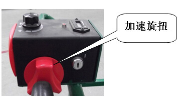 ☆加速旋扭(紅色):啟動時,通過左、右手大拇指向前或向后旋轉操作總成上左、右兩邊紅色的“加速旋鈕”就可以讓電動手推車前進或后退。大拇指旋轉加速旋扭的幅度越小,則行走速度越慢,旋轉幅度越大,則行走速度就會越快,但最快也不會超過龜兔旋鈕設定的速度,電動前進或后退的操作方法都是一樣的。