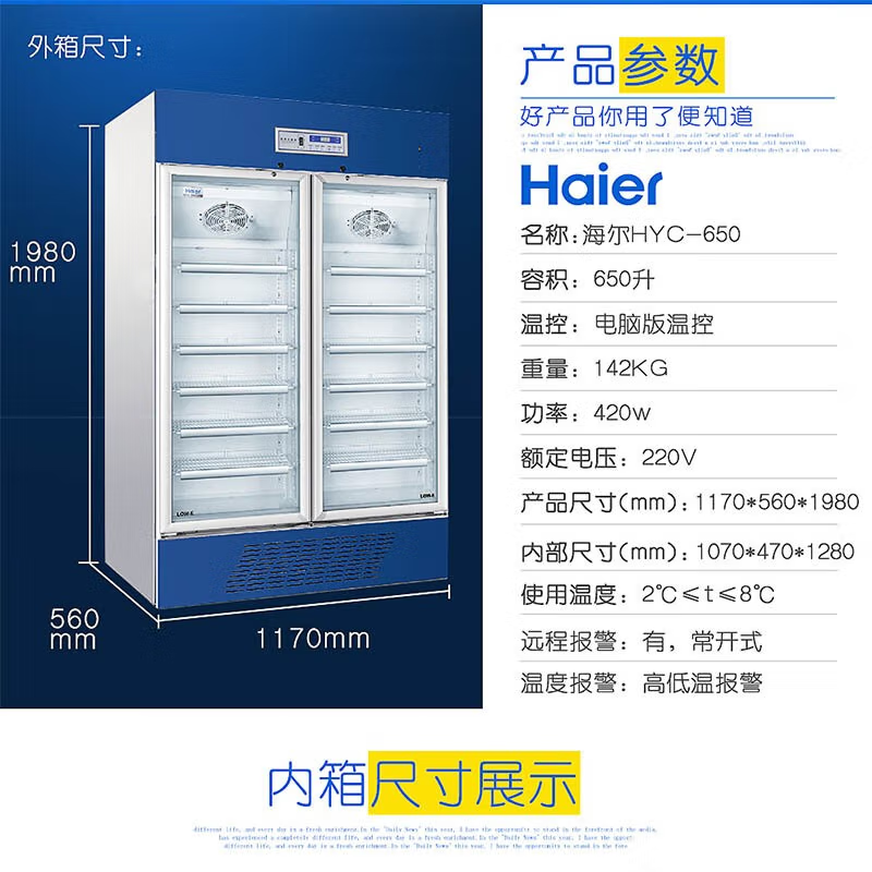 海爾(Haier)藥品冷藏箱 2-8℃醫(yī)藥冷藏柜風(fēng)冷無霜冰柜醫(yī)藥冷柜 藥品保鮮柜HYC-650 自營