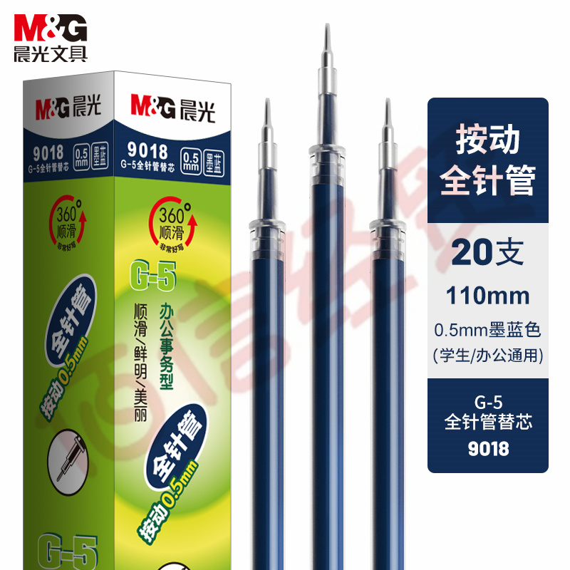 ■晨光墨藍(lán)色0.5mm中性筆按動(dòng)簽字筆替芯 G-5全針管水筆芯 20支/盒9018B1 自營(yíng)