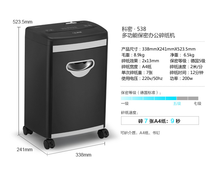 科密S538碎紙機(jī) 中小型單位辦公用五級(jí)高保密細(xì)顆粒狀文件粉碎機(jī) 7張12分鐘2*13mm 自營
