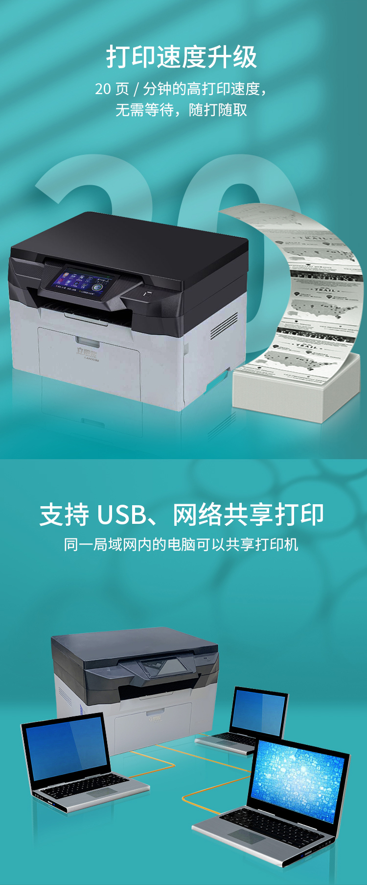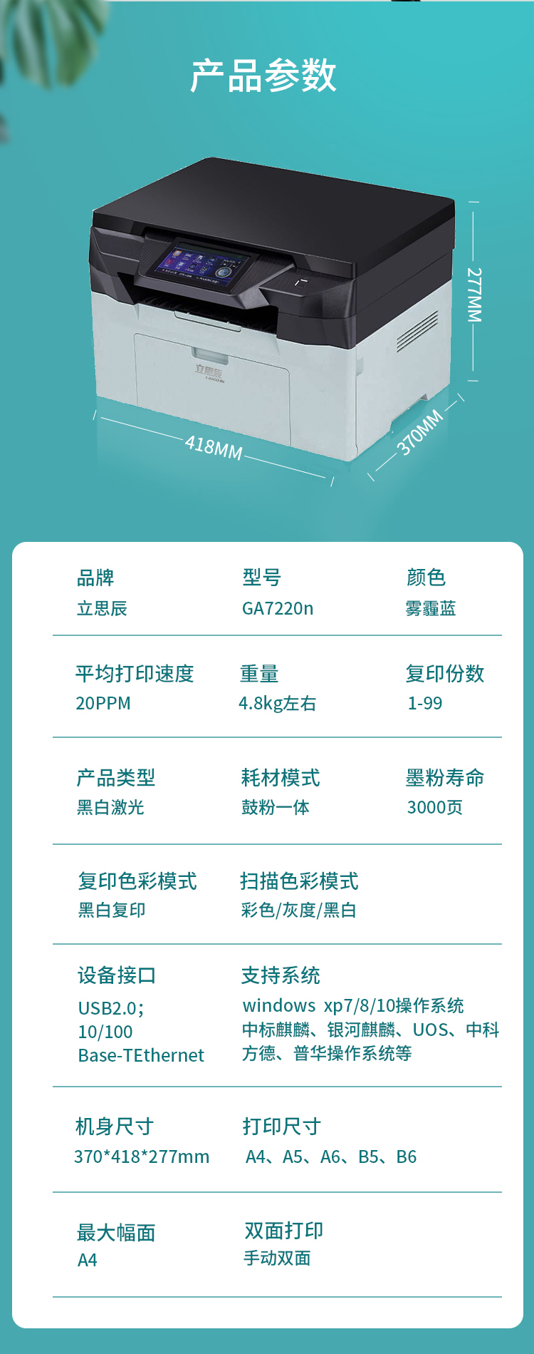 立思辰(LANXUM)A4黑白多功能一體機(jī)GA7220n、A4幅面、黑白激光、打印/掃描/復(fù)印 自營